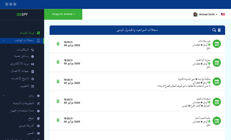 فيما يلي جميع إدخالات التقويم والمواعيد والملاحظات والجداول المحفوظة على الهاتف أو الجهاز اللوحي المستهدف. يمكنك عرض جميع المواعيد مع احصائيات مواقعهم. يمكنك أيضًا عرض طوابع التاريخ والوقت لكل إدخال في التقويم.