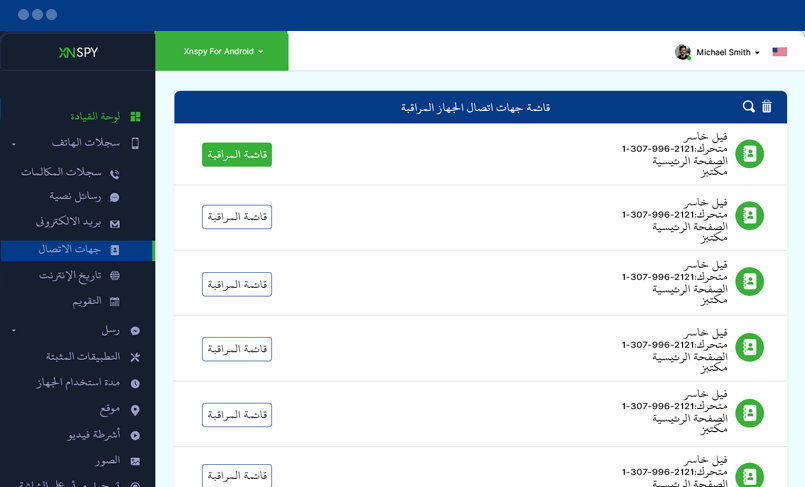 فيما يلي قائمة جهات اتصال الجهاز المستهدف بما في ذلك اسم ورقم كل جهة اتصال محفوظة. يمكنك إضافة جهة (جهات) اتصال إلى جهات اتصال قائمة المراقبة الخاصة بك عن طريق النقر فوق الزر "قائمة المراقبة" بجوار جهة الاتصال هذه للحصول على تنبيهات فورية لأي نشاط ذي صلة.