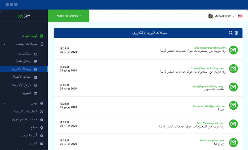 إليك جميع رسائل البريد الإلكتروني المرسلة والمستلمة على جهازك المستهدف. يمكنك قراءة جميع رسائل البريد الإلكتروني ويمكنك عرض معرّفات البريد الإلكتروني لجميع جهات الاتصال جنبًا إلى جنب مع طوابع الوقت والتاريخ.