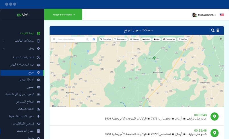 يمكنك عرض جميع الأماكن التي تمت مراقبتها من قبل المستخدم. تشير المؤشرات الموجودة على الخريطة إلى الأماكن التي زارها حامل الجهاز المستهدف. سيؤدي النقر فوق المؤشر إلى إظهار عناوين تلك الأماكن. يمكنك أيضًا مراقبة التاريخ والمدة الزمنية لكل زيارة.