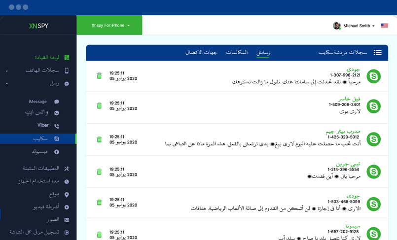 يمكنك التحقق من جهات اتصال سكايب والسجلات هنا. انقر فوق علامات التبويب المعنية لمراقبة جهات اتصال سكايب والمكالمات والمحادثات. يمكنك أيضًا عرض معرفات سكايب وطوابع الوقت والتاريخ لكل مكالمة ورسالة.