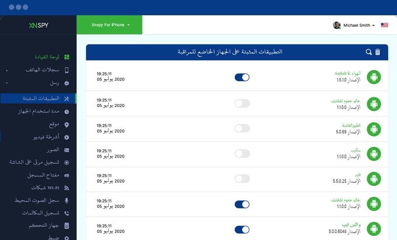 فيما يلي قائمة بجميع التطبيقات المثبتة على الهاتف أو الجهاز اللوحي المستهدف. يمكنك عرض أسماء التطبيقات وإصداراتها بالإضافة إلى وقت وتاريخ التثبيت لكل تطبيق.