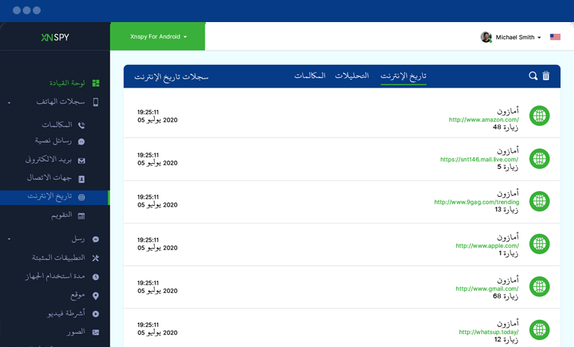 فيما يلي قائمة بجميع مواقع الويب التي زارها حامل الهاتف الذكي أو الجهاز اللوحي المستهدف. يمكنك مراقبة مواقع الويب وعناوين URL الخاصة بها وعدد مرات زيارة موقع الويب. يمكنك أيضًا مراقبة طوابع الوقت والتاريخ لكل موقع ويب تمت زيارته.