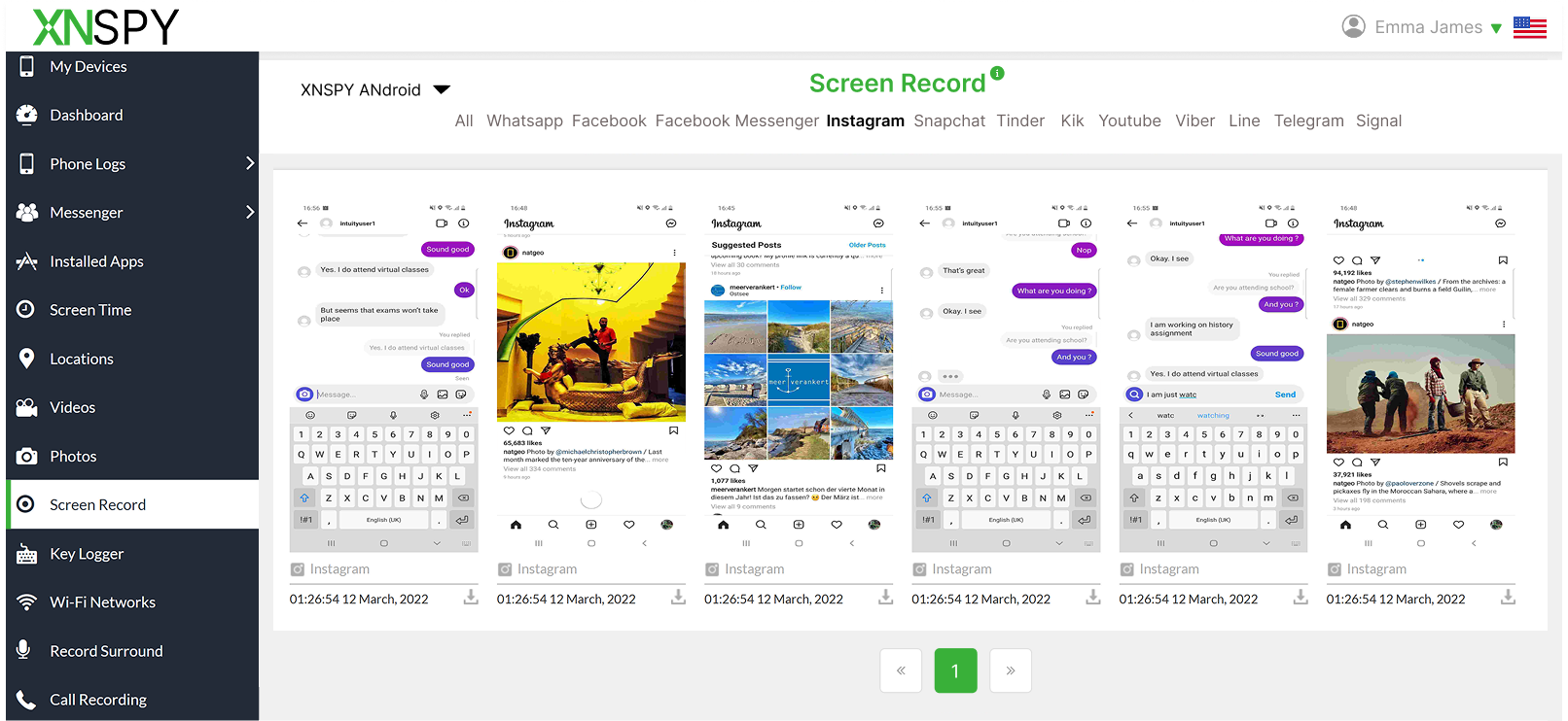 ميزة تسجيل الشاشة في Xnspy هي ما يُمكّنك من رؤية جميع أنشطة هاتفك بوضوح. يلتقط التطبيق لقطات شاشة بعد فترات زمنية محددة، ويرفعها إلى تبويب التطبيق المناسب في لوحة التحكم. كما يُمكنك التقاط لقطات شاشة عن بُعد بناءً على طلبك. بهذه الطريقة، يُمكنك معرفة ما إذا كان طفلك يستخدم إنستغرام حاليًا أم لا.