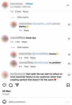 يمكن للتعليقات أيضًا أن تكشف عن النشاط الأخير. إذا ترك أحدهم تعليقًا على منشور قبل دقائق أو ساعات، فهذا يعني أنه كان يتصفح إنستغرام مؤخرًا.