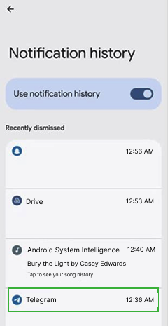 إذا كانت إشعارات تيليجرام مُفعّلة لديك، يُمكنك استخدام سجل الإشعارات المُدمج في نظام أندرويد، أو تطبيقات مُحددة. بتصفحها، يُمكنك رؤية رسائل تيليجرام المحذوفة حديثًا في أي وقت.