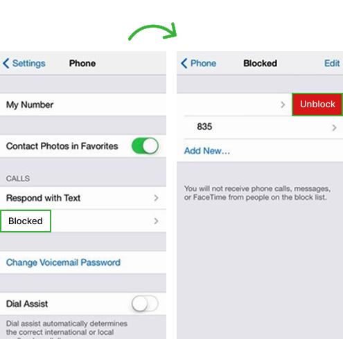 - ابحث عن الرقم، ثم مرر إلى اليسار، وانقر على "إلغاء الحظر".