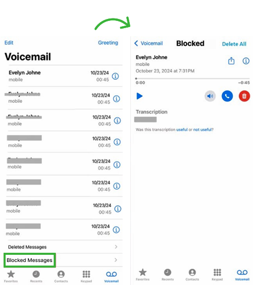 لذا، عندما تحاول جهة اتصال محظورة الاتصال بك، تُحوَّل مكالمتها تلقائيًا إلى البريد الصوتي دون رنين الهاتف. يمكن للمتصل ترك رسالة. للاطلاع على هذه الرسائل الصوتية، يجب عليك الوصول إلى قائمة منفصلة في قسم الرسائل المخفية أو المحظورة أسفل صندوق بريدك الصوتي.