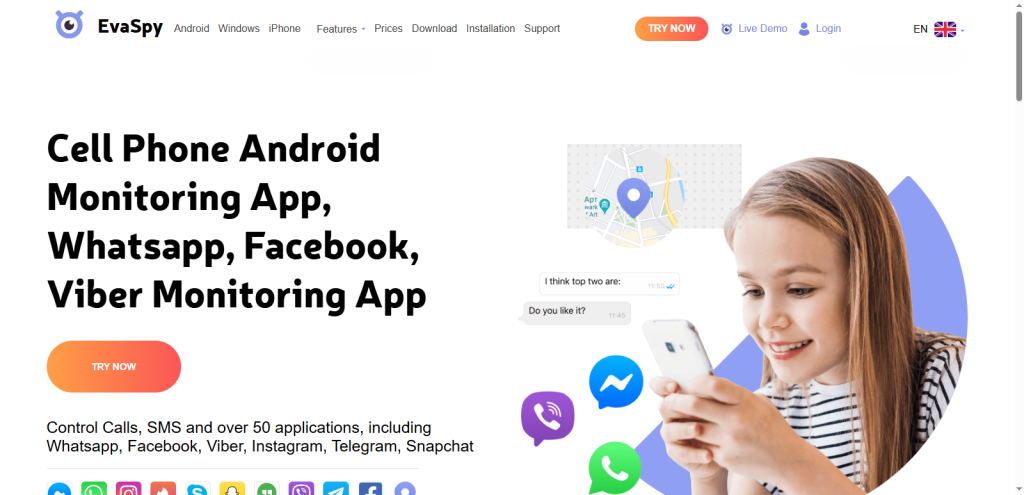 EvaSpy is a device-monitoring and tracking application that allows you to remotely view activity on another person’s phone or computer. The most notable features of the app include tracking calls, text messages, social media chats, internet history, keylogging, location, etc. The app is generally positioned for individuals who want simple access to communications and basic controls rather than deep social media insights.