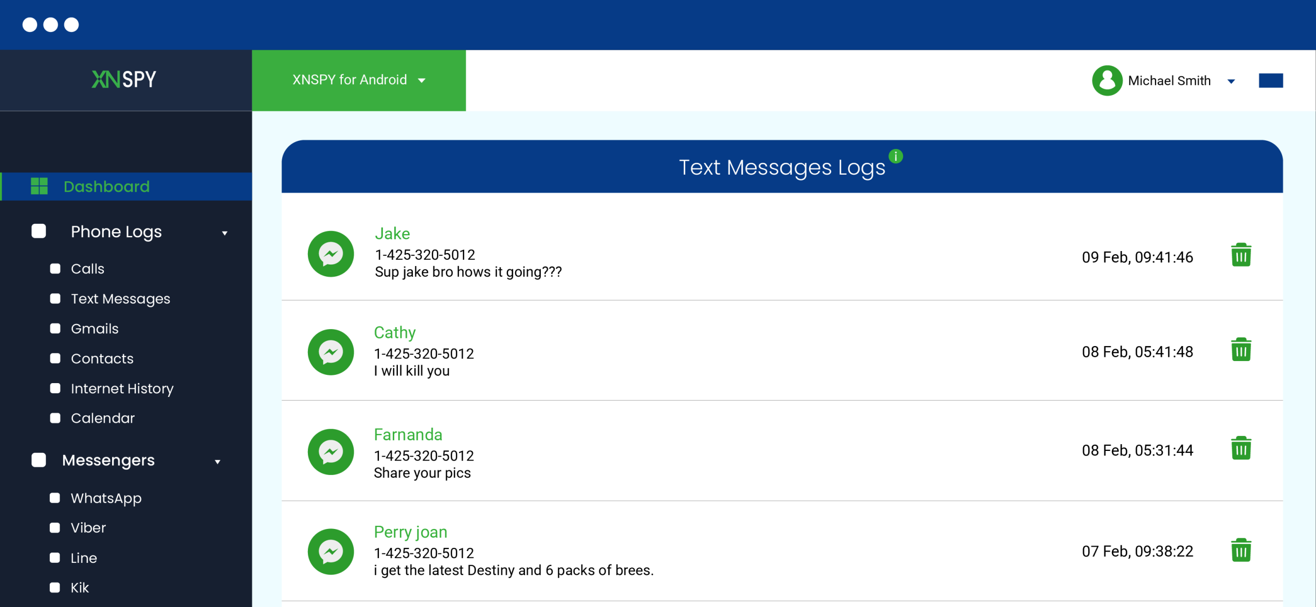 After sending the messages, we checked the dashboard to see how many of them were logged. Xnspy successfully recorded all the messages, displaying both the message content in a conversational thread along with the contact details.