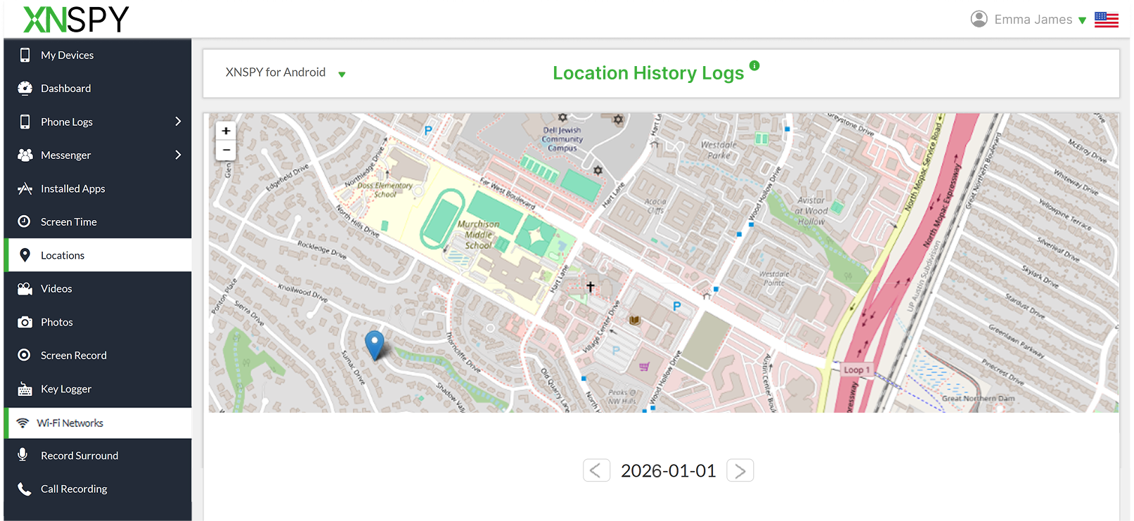 Xnspy uses three different logs to collect a phone’s live location and location history. Through GPS tracking, parents can see the exact address and coordinates of where the target phone is and even navigate to the location using the “Show in maps” button.