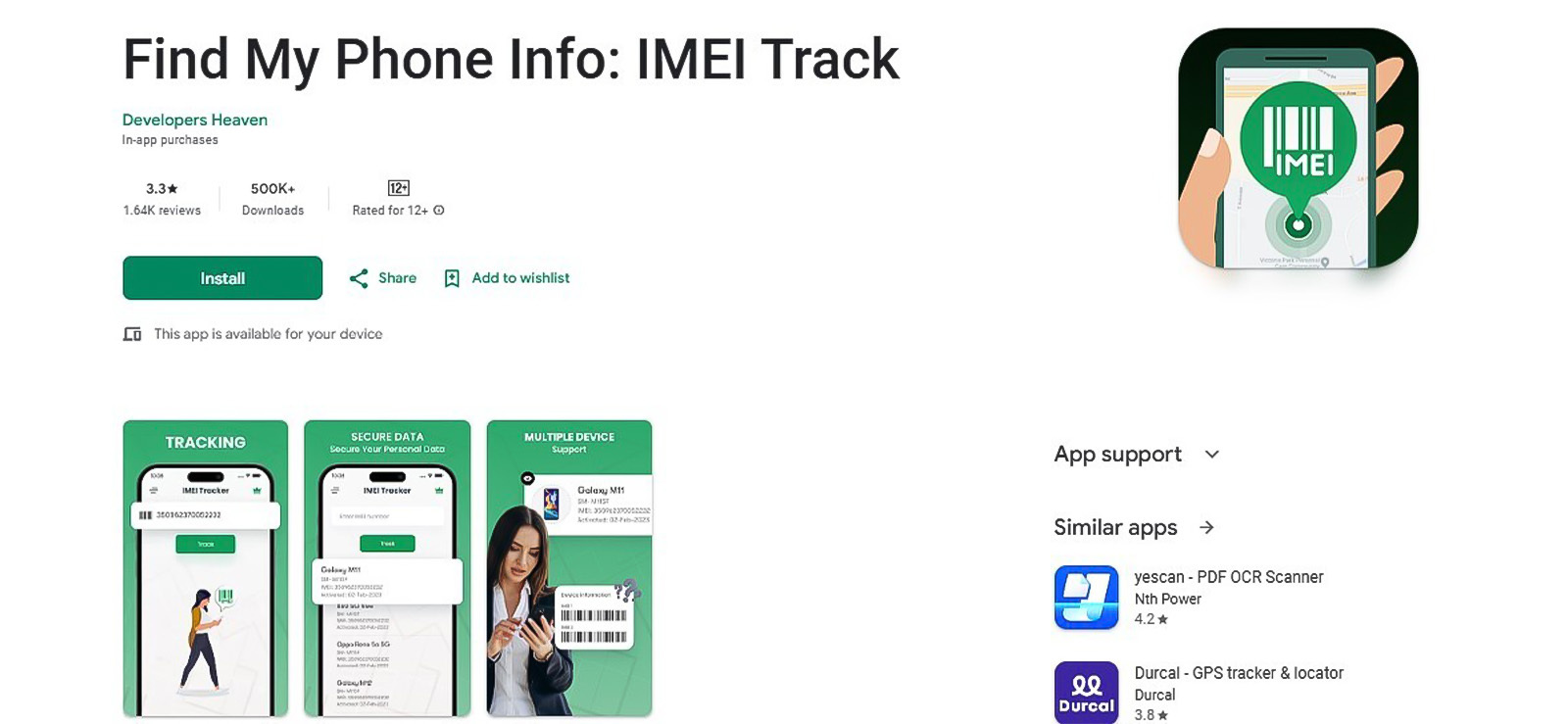 - Go to Google Play Store, look up “Phone Finder – Find By IMEI.”