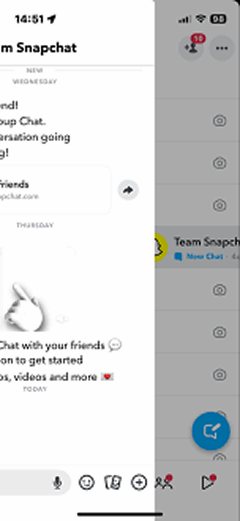 - Gently tap and hold the Bitmoji or chat icon, then slowly drag your finger to the right, without letting go completely.