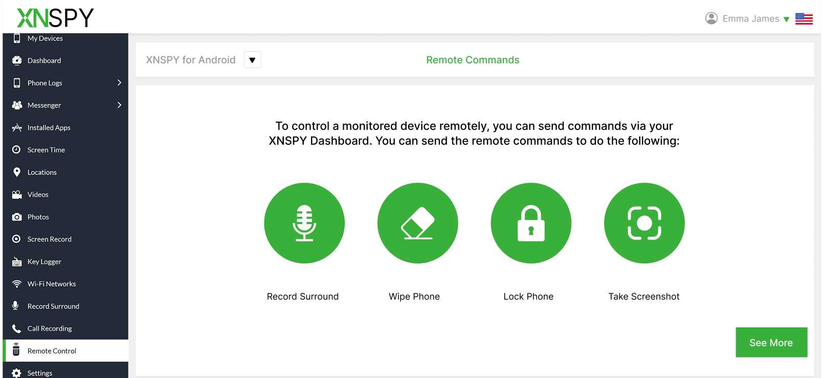 不正アクセスや盗難にあった場合に備えて、リモートワイプを実行してすべてのデータを消去し、スマートフォンをリセットすることもできます。もう一つの便利なツールは、対象デバイスの画面のスクリーンショットをコマンドで撮影する機能です。この機能を使えば、デバイスを実際に手に取ることなく、どのアプリやコンテンツが閲覧されているかを正確に確認できます。