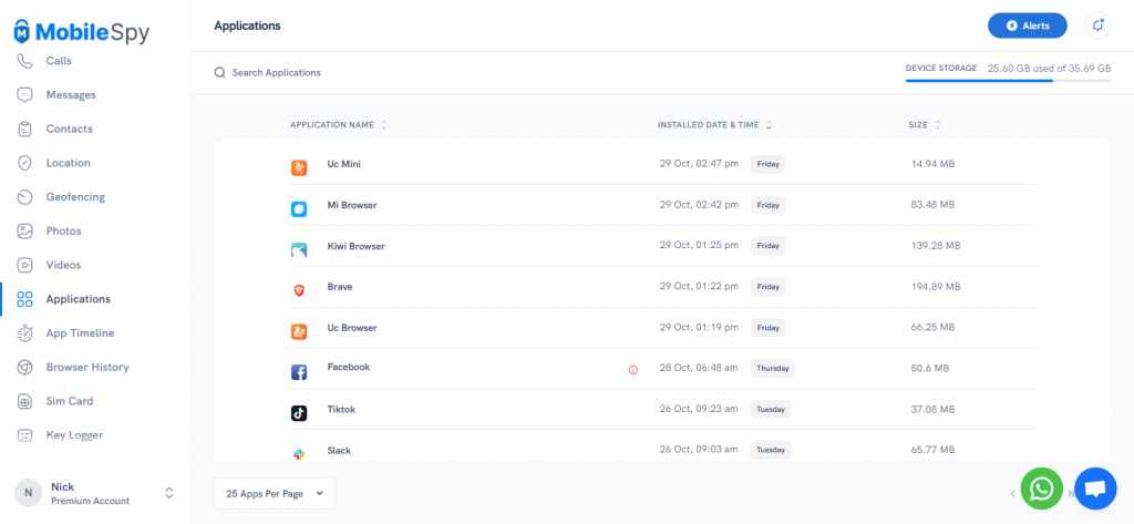 The MobileSpy Applications feature is straightforward and basic. It shows all the apps installed on the target phone, along with their installation time and date, and the space they occupy on the cell phone. Apart from that, the feature didn’t display any information.