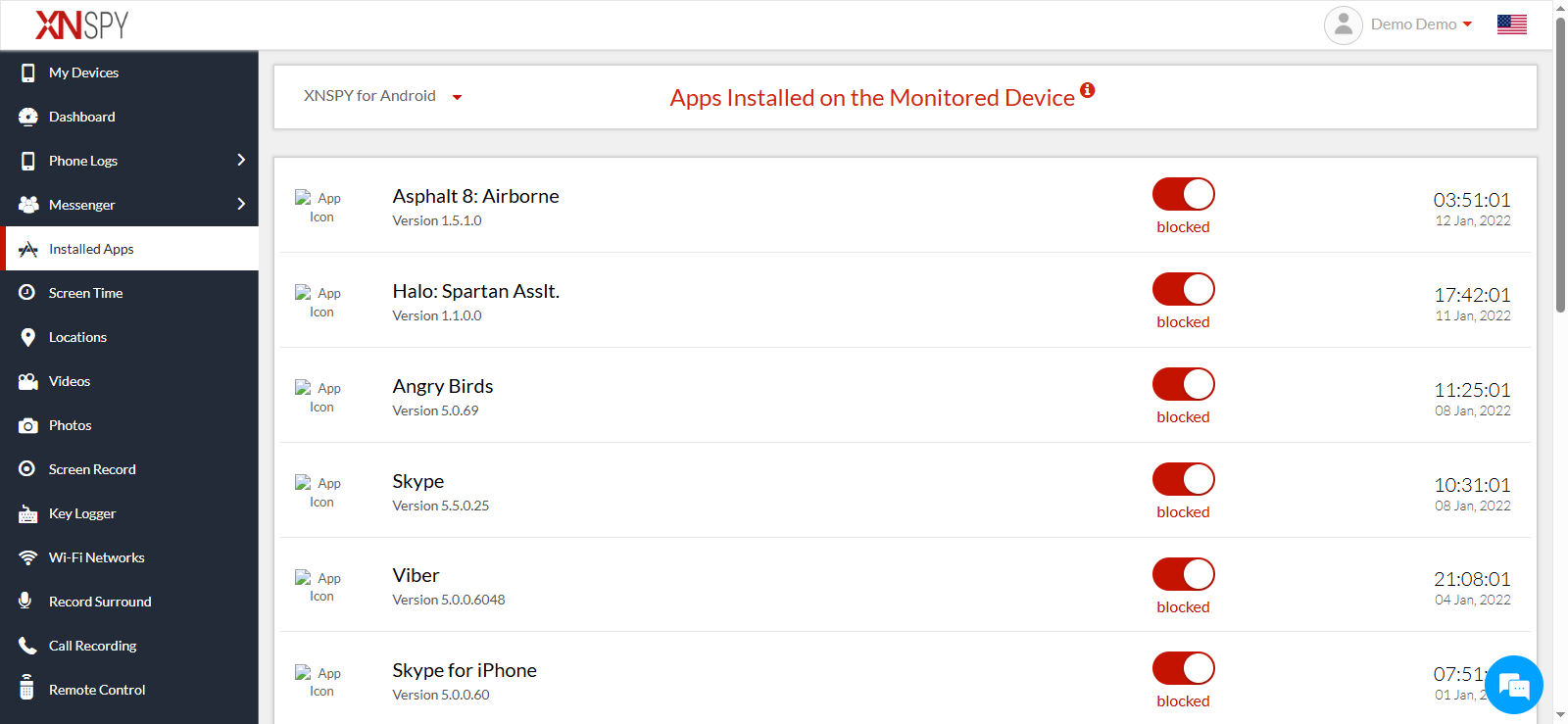 Xnspy provides a detailed view of all installed apps, including installation dates, usage frequency, and version details. The app list updates in real-time, so even if the target person installs any app for a few minutes, Xnspy will capture it and show it in the list.