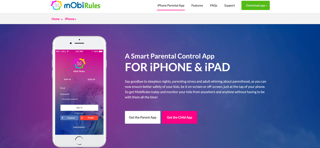 To get started, you need to first install the app on the parent’s phone. Once downloaded from the app store, you need to create a MobiRules login. You can also sign in with a Facebook or Google+ account. Once installed, you need to add the child’s device. Follow all the instructions to get the activation code.