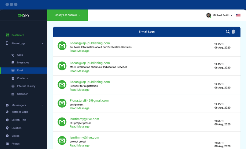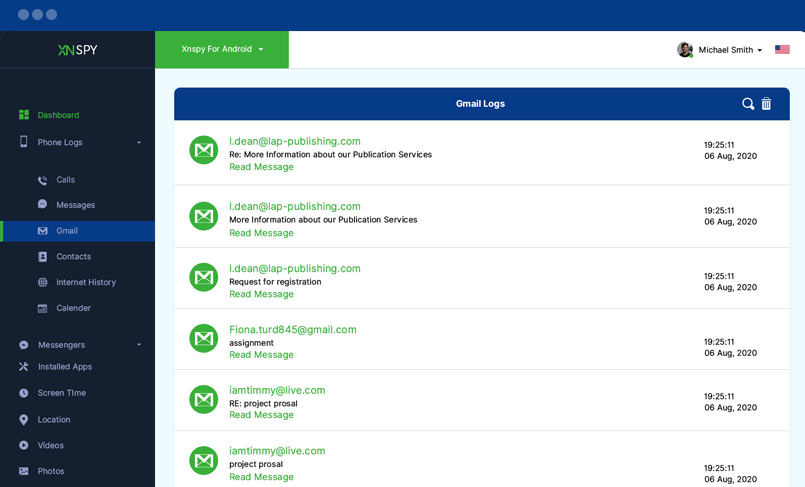 Aqui é onde você pode rastrear todos os e-mails recebidos e enviados. O XNSPY permite